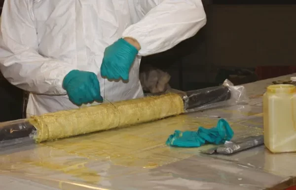הספגה: מספיגים את הבד בשרף באופן אחיד, תוך הקפדה על יחס נכון בין הבד לשרף (בדרך כלל 60:40 בד:שרף במשקל).